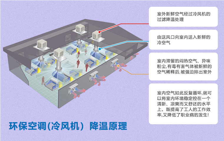 在空氣不流通的環(huán)境中,尤其是化工車(chē)間,容易產(chǎn)生建筑綜合癥,如悶熱、頭疼、眩暈、過(guò)敏、咳嗽等不適癥狀。使用環(huán)??照{(diào)(冷風(fēng)機(jī))通風(fēng)降溫方案即可以有效降溫,又能保證空氣流通